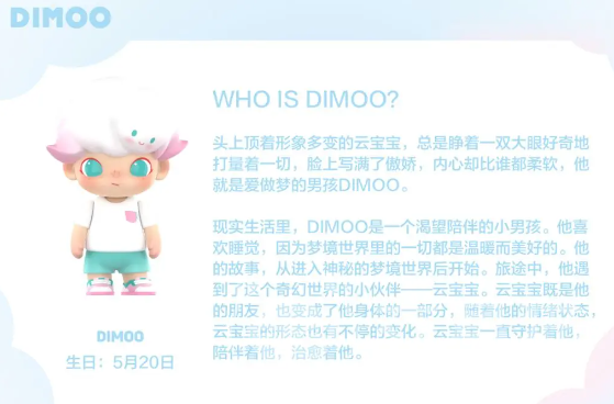 DIMOO在现实的生活中是一个性格相对比较内向的小男孩,很害怕接触广阔的世界,也不喜欢和身边的人接触。但实际上是一个特别喜欢探索新世界,渴望和大家接触的小男孩。在梦境的世界中总是非常的积极主动,而在这一个世界中会认识多个不一样的朋友,绝大部分都是有缺陷的朋友可以实现共主。