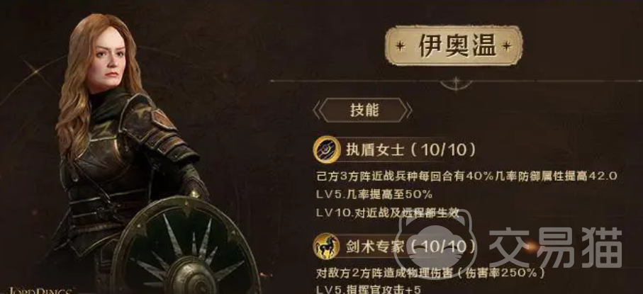 伊奥温的技能【执盾女士】可以提高士兵的防御力,并且每个回合有40%的概率可以让阵营中所有角色的防御属性提高42.0,并且对远程和近战都有效果,技能【剑术专家】可以对敌人阵营造成物理伤害,伤害倍率为250%,并且伊奥温的支援能力很强,她可以随意安置在各类的不同的战场中。