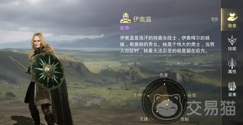 在游戏内,伊奥温的品质为史诗级,作为【输出支援型指挥官】,她拥有较高的伤害和生存能力,也有不俗的支援速度,并且在防御力方面,她也能为战线增加防御实力,拥有分割战场的能力,并且【伊奥温】还拥有能够提高己方生存能力的效果,不仅如此这个角色攻守兼备,可以做到击杀完成敌人的前提下保护战友。