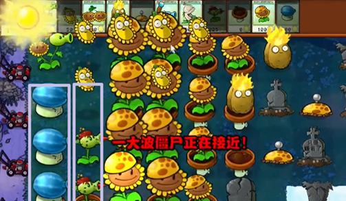前期用免费的小盆菇与土豆雷进行过渡即可,到了中后期我们确保自己有了两排的阳光向日葵后,再去种植冰瓜大喷菇,将其放在中间位置,因为这个植物可以直接攻击三条路的敌人。