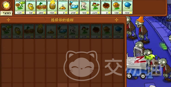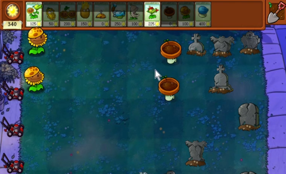 开始大家不用犹豫,可以直接利用手中500的阳光来种植阳光向日葵,这样后期才能不缺阳光,同时因为会有一两个僵尸来进行攻击,所以大家可以种植小盆菇,这个植物是不需要阳光的只要冷却好了就可以种植。
