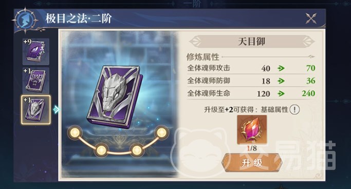 每一种心法都有好几级,而每一级中又固定有几个小阶段,玩家的每次修炼都可以点亮其中一些小阶段,心法小阶段都满了之后就可以消耗“落日血精”来升到下一级,同时开启全新的养成空间。