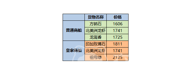 经过小编的一些测试,该航线的刷新时间为30分钟线路的话,可以选择顺时针或者是逆时针,整体刷起来还是比较方便易上手的。掉落货品方面的话,普通商品是方纳石,北美洲龙虾和龙涎香,皇家上船的话可掉落印加玫瑰石,北美洲龙虾和祖母绿,两种商船在货物对比方面价格浮动差不多在200~300之间,不过小编觉得这个差别并不是特别大。