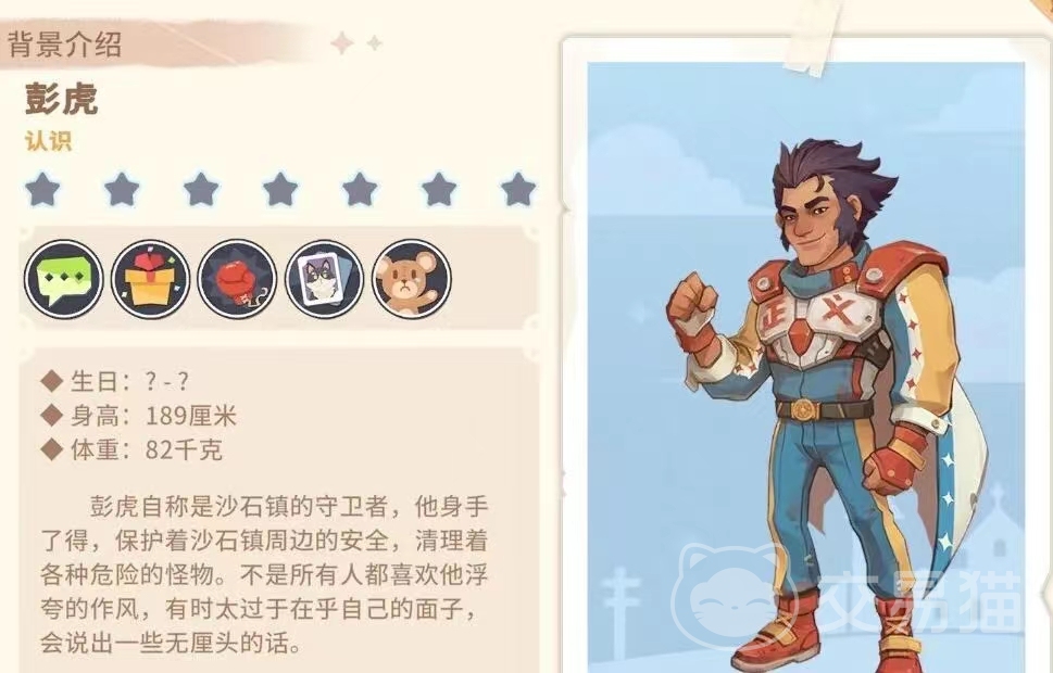 4. 彭虎是一个具有正义感的角色,他在游戏中一直保护着沙石镇周边的安全,故而他喜欢东西多为一些具有防御与攻击能力的武器。例如青铜剑盾、青铜枪、青铜匕首、青铜大剑等。此外,他在游戏中也是一位极具冒险精神的角色,所以他非常喜欢一些在探险时可以用到的装备,例如沙漠探险可以穿搭的背心,长裤,靴子、帽子等,此外他也与米安同样非常喜欢那些和矿井救援队相关的装备。