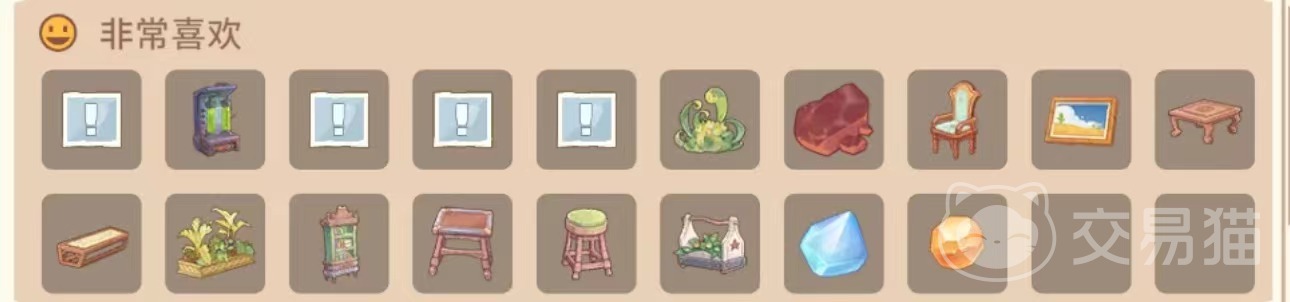 1. 米安在游戏中是一个活泼开朗、充满探索能力的角色。她非常喜欢一些特别的物品,铁质多用镐,铁质多功能斧,与矿井救援队相关的装备如上衣、下装、帽子等,不死草,龙血竭,孟钢板,铬钢锭,铸铁板,涂鱼王等。同时她也喜欢一些实用的东西,例如多功能办公桌,机能竖箱,机能方桌,方桌,怀旧书架,镁矿石,钛矿石,钢架,硬化剂,塑化剂等。