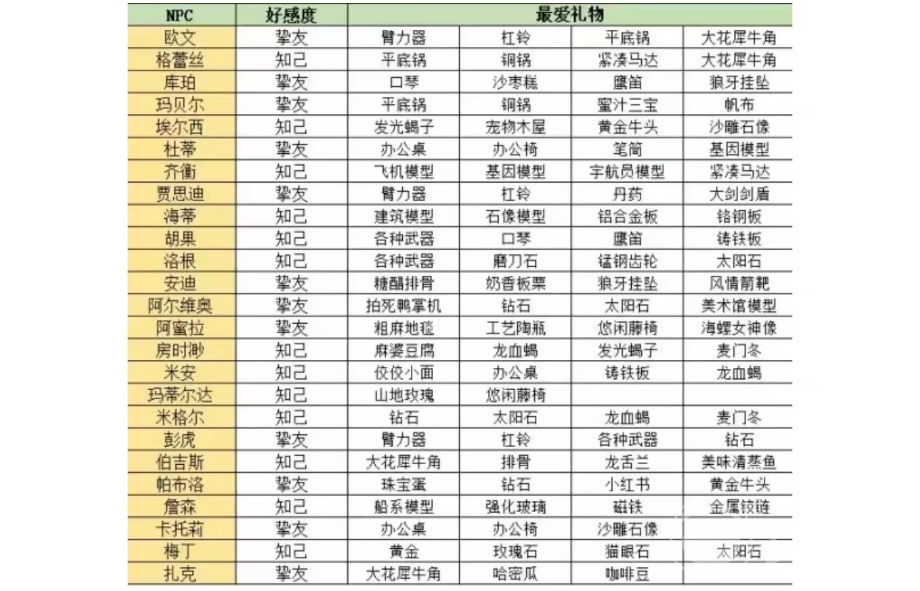 《沙石镇时光》中的人物众多,他们各自有着不同的喜好。送她们相应喜好的礼物可以提高好感度。各角色喜好一览: