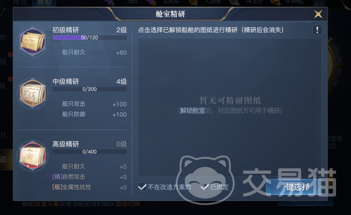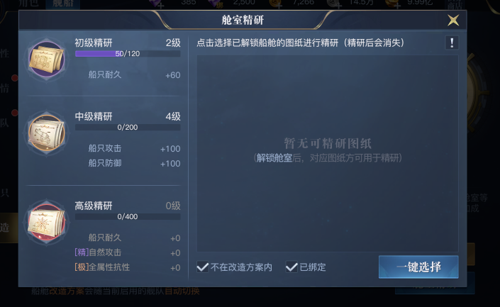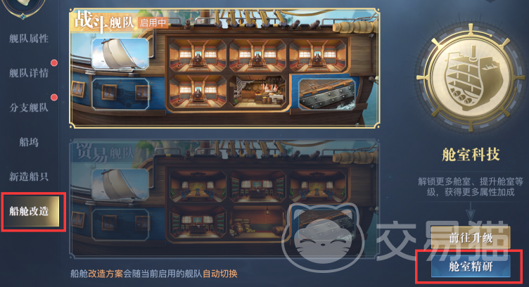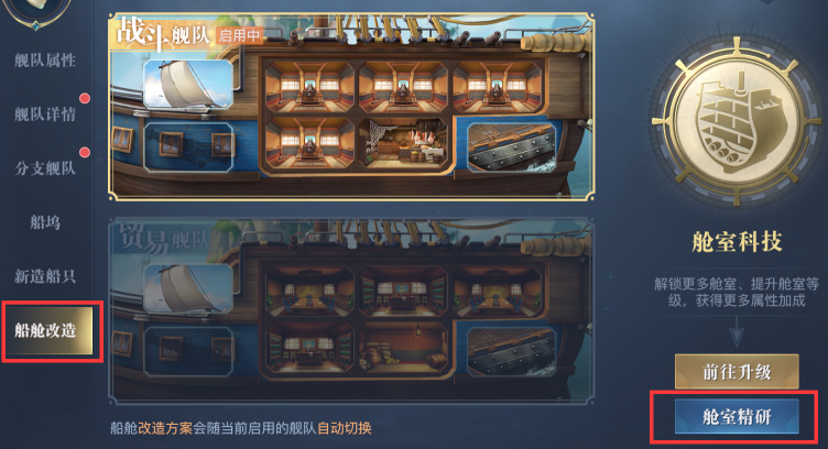 如果想要改造船舱的话,那就需要通过游戏里面设定的舱室精研功能功能完成船舱的改造,在刚开始玩游戏的时候,玩家是没有这个权限的,只有等级达到63级才能开启这个功能,达到等级的玩家可以直接点击船只,这样就能进入到船舱改造,再次点击舱室精研就能进入到修改页面。