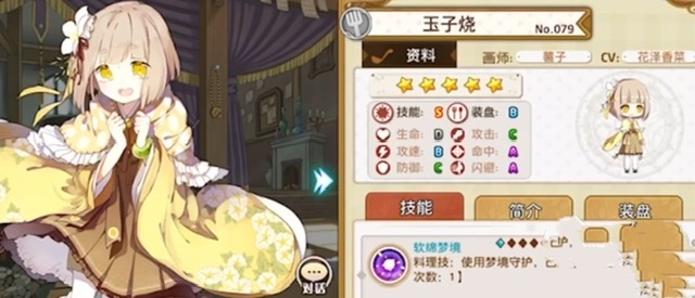 玉子烧在队伍中的角色定位非常明确,虽然她的生命成长只有D级,防御成长为C,攻击也只是C级,但她的闪避和命中可是达到了A级,攻速为B级。别看这些属性似乎不够亮眼,玉子烧的真正厉害之处在于她的技能。作为副菜,她的技能作用远远超过了本身的属性。