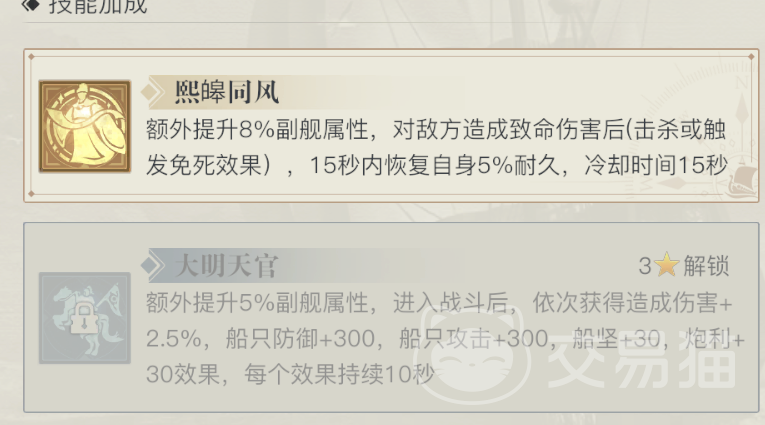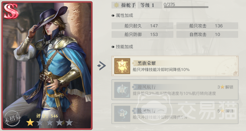 然后就是威廉基德,这个人物在游戏里可以担任操舵手,船只的耐久攻击防御和麦哲伦差不多,只不过这个角色在游戏里起到的是对于冷却速度的提升,如果角色现在是一星,那船只的冲锋技能冷却时间就可以降低10%,等人物升到三星之后船只还会增加3%的战斗转向速度,以及10%的航行速度,如果决策能提到五星的话,那船只的冲锋技能就能降低5%,获得这个角色,需要去竞技商店里面购买,是一个实用性很强的角色。
