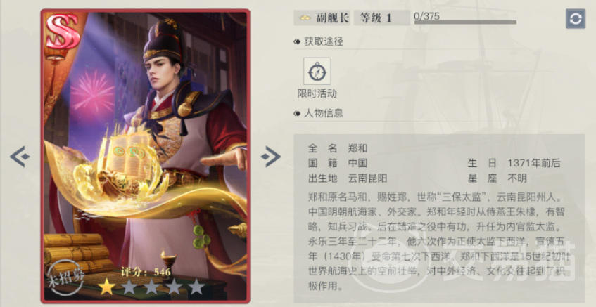 最后要给大家介绍的就是郑和,这是中国最出名的一个航海士,角色担任的是副舰长的位置,初始的属性和上面两个角色都是一样的,这个角色在游戏里可以提升附件的属性,一星提升83%,三星和五星都会在原有的基础上再提升5%,同时船只的耐久度,攻击持续时间以及冷却时间都会相应的得到提升,算得上是游戏里最优秀的一个角色,可以通过东方传说这个活动开启的时候进行招募。