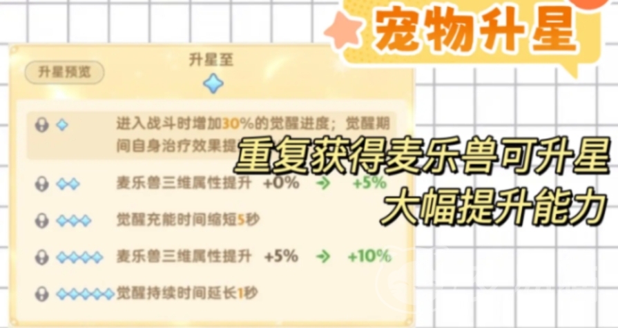 提升麦乐兽的星级是增强其能力的重要途径之一,升星可以提升觉醒技的效果、持续时间、冷却时间以及麦乐兽的数值。不同星级的麦乐兽有不同的升星上限,而升星所需材料包括闪闪结晶和麦乐兽碎片,可以根据麦乐兽的品质和需求来选择合适的升星路径,主要升级主战宠物的星级,以提高觉醒技的效果和频率,加速推图进程。