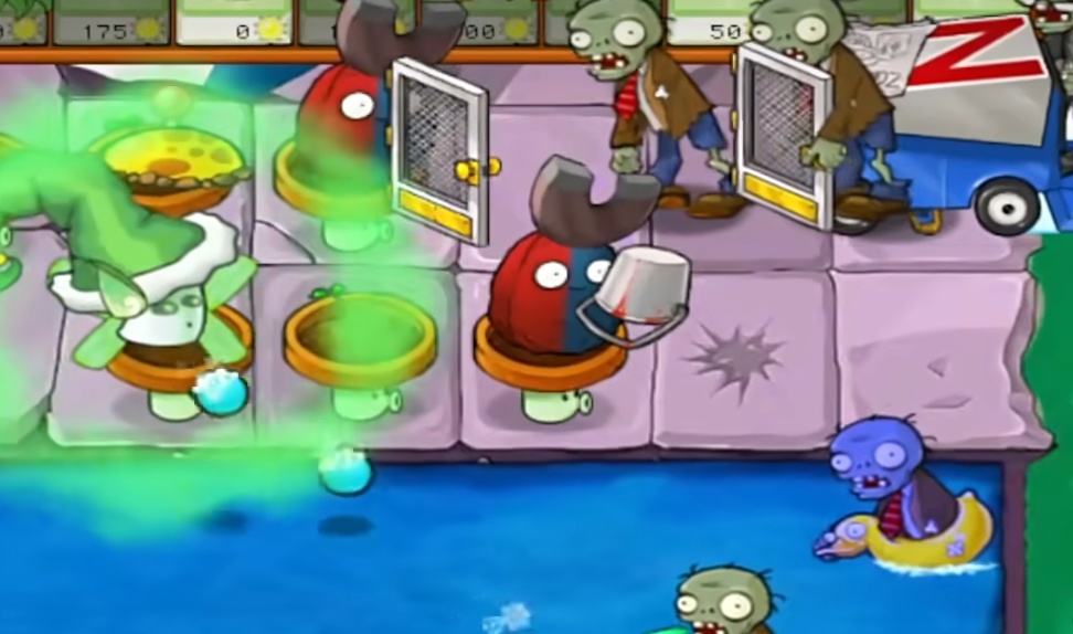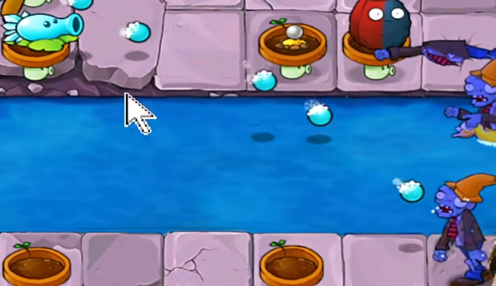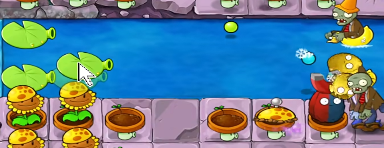 一开始的时候玩家们需要先建造几个向日葵来获取点数,之后在两条水路上进行布置莲叶豌豆。一开始的时候敌人出的数量会比较多,但是整体的实力不算强,玩家们可以在中间路放置冰冻豌豆1-2个,这样的话基本上前期的敌人都可以很顺利的看住了。
