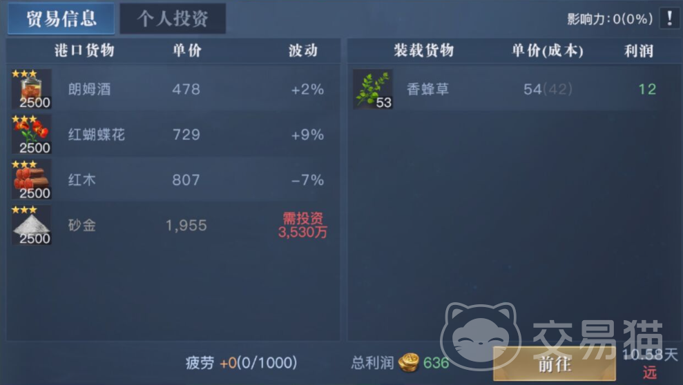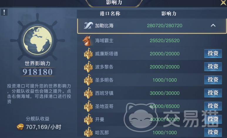 除了货物外,我们还可以对其港口进行投资,海域霸主中有一项要求就是影响力达到40%以上,在此处进行投资可以帮助我们完成这项要求,虽然投资额比之前的所有海域都要高,但是投满后的收益也会很高,影响力高了后不仅能解锁很多高收益的5星货物进行贸易,还能提升分支舰队的收益。