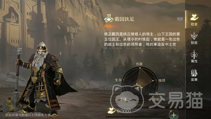 首先是属性方面,该角色拥有满格的伤害属性和统领属性,毕竟他是一位神话品质角色,作为最高品质的角色这两项属性满格是非常正常的。