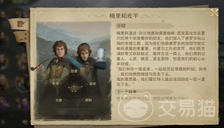 梅里和皮平的指挥官定位是辅助型,面板属性虽然比较弱,但是统领能力和生存属性比较好,同时因为霍比特人极快的移动速度,也能让这两人在实战的时候能够躲避敌方的攻击,保证自身的安全。