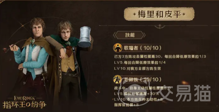 梅里和皮平一共是有两个主要技能,第一个叫做歌唱者能增加自己阵营30%的基础攻击力,但是大家需要注意这个只能维持三个回合并且每个回合开始就会降低三分之一,他们的第二个技能叫做毛脚族能提高军队的整体速度,同时还能增加自身8个点的主动性属性。