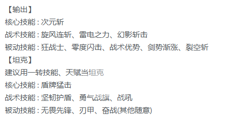 如果走的还是坦克方向的话,核心技能盾牌猛击不变,战术技能和零级的时候一样,用坚韧,战吼和战旗,被动技能也不变。很适合萌新玩,没有太多技巧。