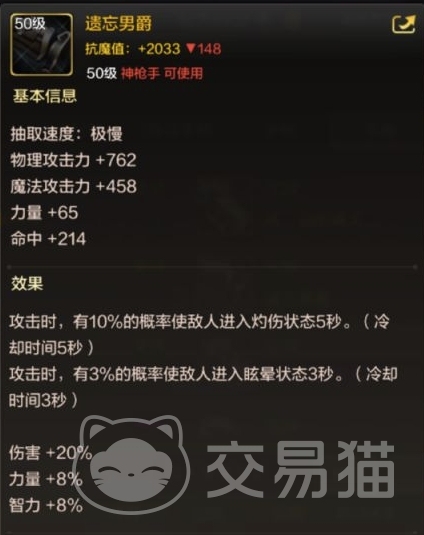 首先来说下武器选择,小编推荐玩家使用遗忘男爵这把武器。武器类别是手炮,属于史诗级别。这个武器面板很高,物理攻击高达762,力量方面也有65的加成。玩家使用这把武器攻击敌人的时候是有一定概率给敌人施加灼烧的,让敌人持续扣血。