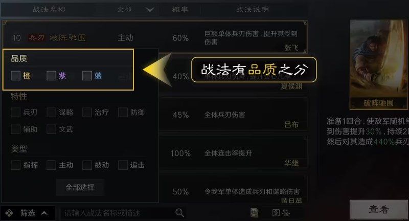 战法也是有品质的,目前最高是橙色的,然后是紫色的和蓝色的。大多时候蓝色的战法价值不高,只有初期过渡以及实在没有富裕战法可用的时候才会考虑。而紫色战法中则有部分堪比橙色的顶级战法,像是铸甲消戈、如有神助、避其锐气,这三个都是非常厉害的堪称T0级的紫色战法。