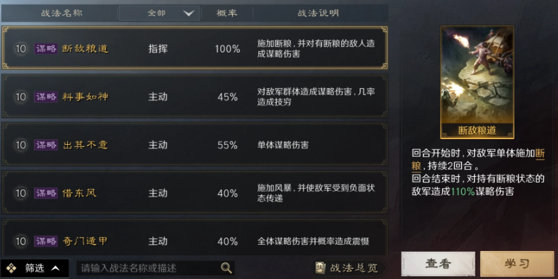 谋略战法:主要是能造成谋略伤害并附加一些状态的战法,也有主动和指挥类的区别,主动类通常是单体或者群体的伤害技能,而指挥类的不仅可以造成伤害还会附加一些特殊的效果,例如断粮。谋略战法通常适合高智力的武将携带。