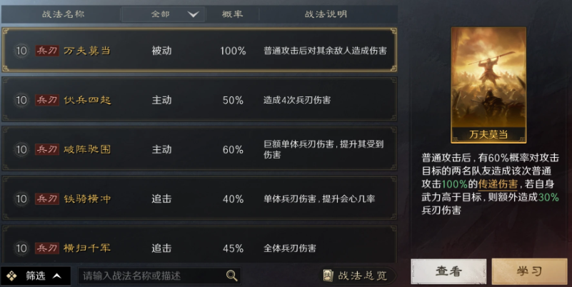 兵刃战法:故名意思主要是造成伤害的战法,细分也可以有被动、主动、追击的区别,通常不仅能造成兵刃伤害还会有一些附加效果,适合给武力值高的武将携带,具体要携带主动被动还是追击要看武将本身的特点。