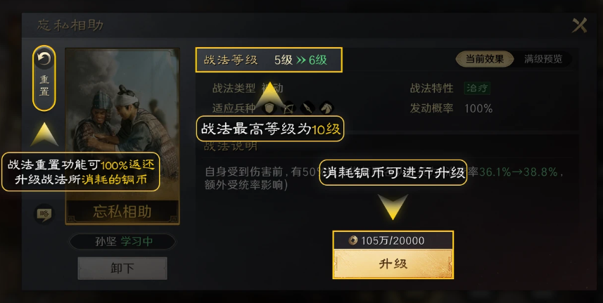 目前战法满级是10级,只需消耗铜币就可以给战法升级,而且还可以利用【战法重置】来100%返还升级所消耗的铜币,不过每周只有前10次重置是免费的,后续重置的时候10~20次每次重置需要消耗20点黄金,20次之后则是每次消耗50点,每周一的0点会重置免费重置的次数。