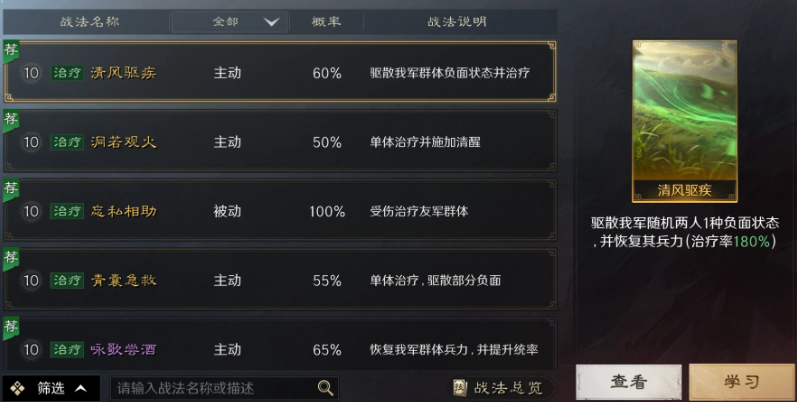 治疗战法:给队伍提供治疗的战法,有主动和被动效果,有的还附带一些特殊效果,例如驱散负面效果,提升某项属性。治疗战法无疑适合给辅助类武将携带,合理配置能让队伍的续战能力有极大的提升。