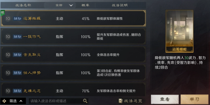 辅助战法:主要给提供各种增益给队伍带来极大加成的战法,一般也是给辅助类武将携带,能提升队伍的整体实力。