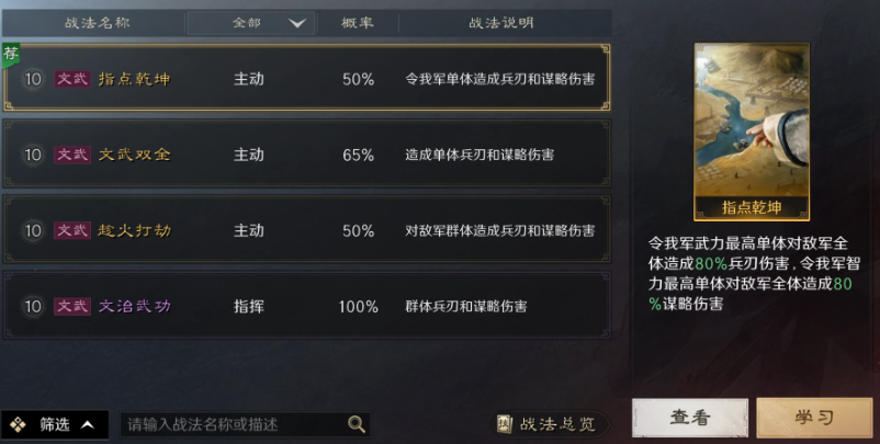 文武战法:有的武将武力和智力都很高,而文武类战法给其携带的时候可以同时造成兵刃和谋略伤害,伤害全面,适用环境广。