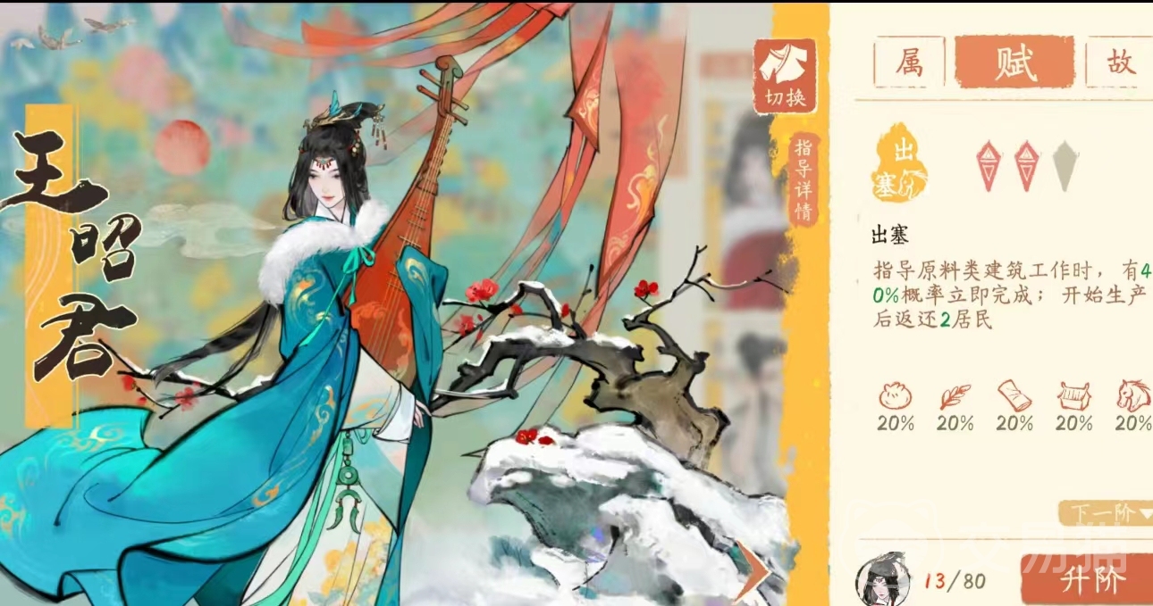 所以在王昭君的使用与任务分配上,推荐玩家将原料型的建筑工作分配给王昭君,将王昭君分配在一些田野、草原或是养殖场上,以此最大化的利用王昭君在生产上的优势,帮助玩家更快地获取更多的资源储备,以便为游戏后续的升级发展积累经验和打造基础。