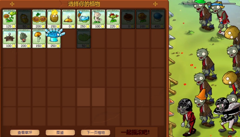 因为向日葵是必备的,所以一定要选上,场景里面有水池,有了睡莲之后才能种植其他的植物,然后就是像豌豆射手这种常规的攻击植物,当然除了普通的攻击植物,还要选上带有减速作用的植物,游戏里玩家一共可以选择14个植物,总共有16个备选,所以除了吞噬墓碑的树桩以及阳光之外,别的都可以选上。
