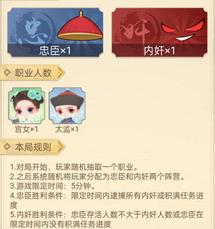 玩过狼人杀的玩家都知道,在游戏里阵营以及角色都是随机的,紫禁十二时辰的设定也是一样的,玩家其实是没有办法选择自身阵营的,在每一局游戏开始之前,系统都会显示出在这一局里的所有职业,玩家会随机抽取到一个职业,然后系统会自动把玩家随机分配到两个阵营的其中之一,玩家需要做的就是在五分钟之内确保自身阵营能够赢得胜利。