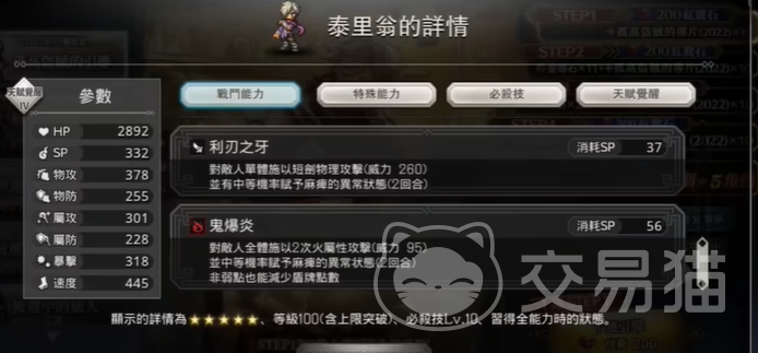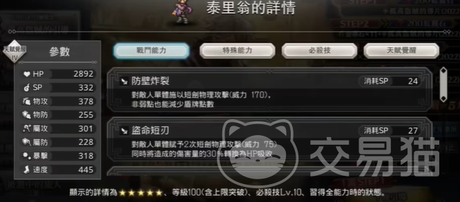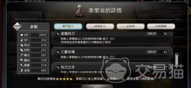 以上就是本期分享的有关歧路旅人大陆的霸者泰里翁的全部信息内容,这个角色不管是品质还是他的技能实战效果都是很强的,前期的时候小伙伴们用来做主线任务是很快的,可以说同一批里基本上没有什么角色能跟他对打,可想而知他给大家带来的实战收益效果有多少。