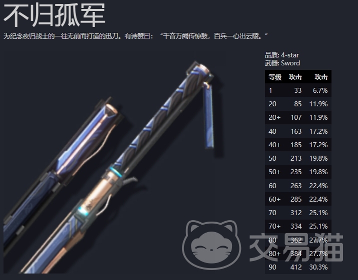 不归孤军有着十分典型的四星武器数值面板,四百出头的攻击白值加上30.3%攻击力加成,让它在一众四星中并没有显得非常出众,但也说不上低,至少可以说是正常中上的水平。