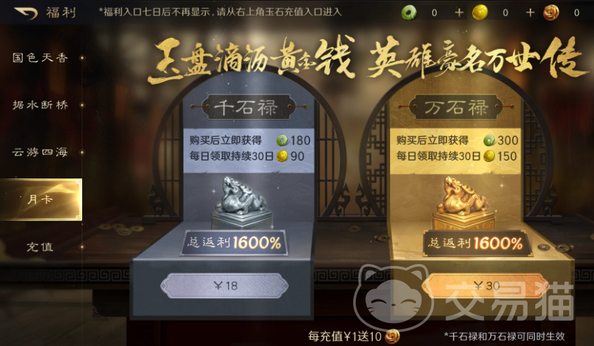黄金则是游戏内更为泛用的货币,主线任务、系统活动、霸业阶段、同盟活动都能得到黄金,嫌麻烦也可以直接用玉石按比例兑换。如果打算长期玩,那么系统福利活动中的月卡建议入手,每天有固定的黄金收入。