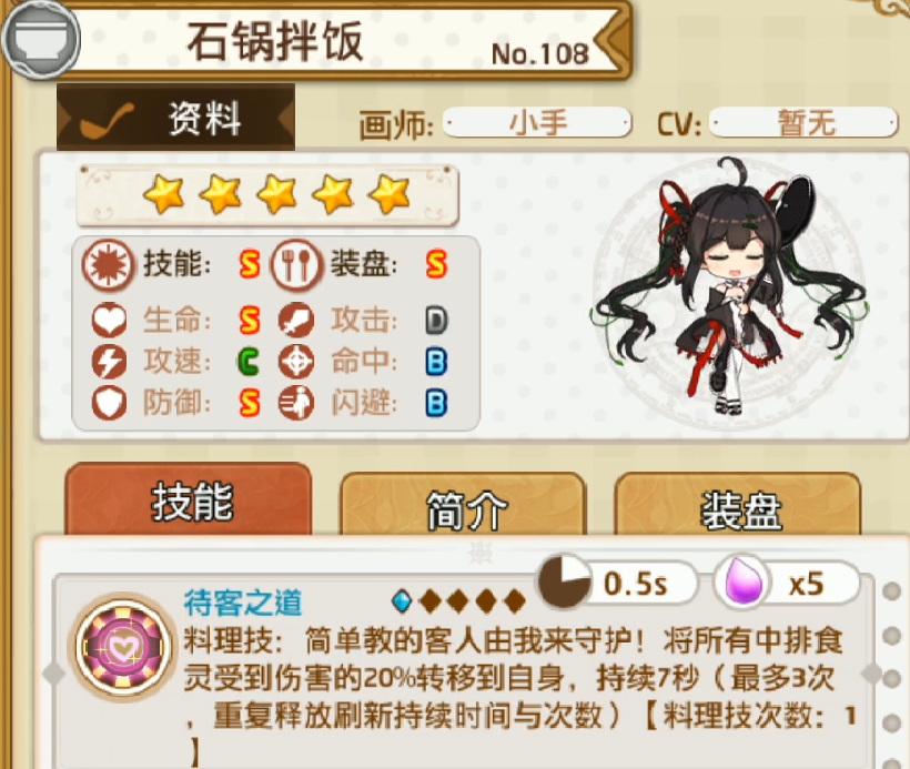 石锅拌饭是属于限定食灵,这位食灵在目前版本还没有出现,之后应该也是会以限定食灵的身份出现。她作为主食来说本身的属性非常不错。首先生命以及防御的成长性都是S,闪避也有着B级。攻击为D级,命中则是B级,攻速为C级。