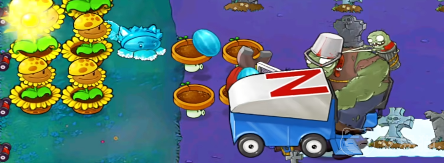 前期因为莲叶豌豆本身就有着攻击力,所以可以在上面放向日葵来增加点数。之后可以在中间的陆路放上两个冰冻豌豆,这样整个地图基本上都可以攻击到了。前期的重点布防还在是两条陆路上,登封点数跟上来后便可以换成冰冻的植物外加炸弹了。