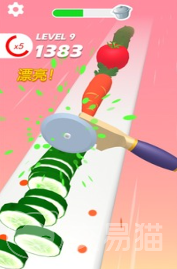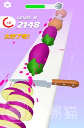 其中的玩法就是指尖点击控制小刀去切割迎面而来的蔬菜水果,将千奇百怪的蔬菜水果切成小块,屏幕上四溅的水汁和切割特效,都可给人极致的解压感。对于菜刀的形状也是千奇百怪,能够让你感受不同的切割快感,也可快速将难切的水果搞定。针对不同的刀具切割发出的音效和特效也存在差异,要是能够连续切割就会过得高分和专属的赞扬语音包,激发玩家们的斗志,大家可根据关卡的难度去搭配更加合适的刀具哦。