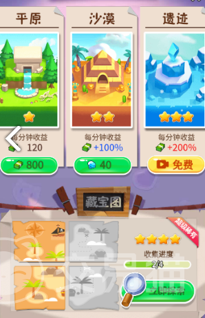 这第四种小游戏是寻宝小游戏,玩家需要选择一张地图开始寻宝,在选择好后需要获取藏宝图,之后需要根据藏宝图上的线索在该地图上寻找宝藏,这宝藏每找到一个就可获得一颗星,获得三颗星后即可通关。