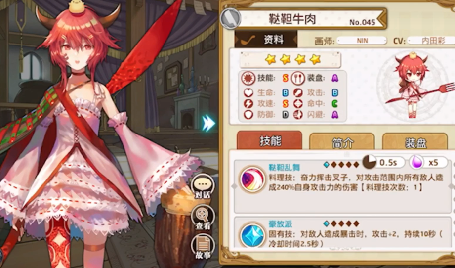 角色在游戏里的料理技能为鞑靼乱舞,一旦使用这个技能,那么角色就会挥起手里的叉子,对所有攻击范围内的敌人带来240%~360%的伤害,这个伤害决定值的多少直接是玩家现在自身攻击力数值多少决定的,角色的另外一个技能就是固有技能豪放派,一旦使用这个技能,那么就会对敌人带来暴击,能有持续十秒的伤害,攻击值会加点2~8,整个攻击伤害可以叠加四层之多。
