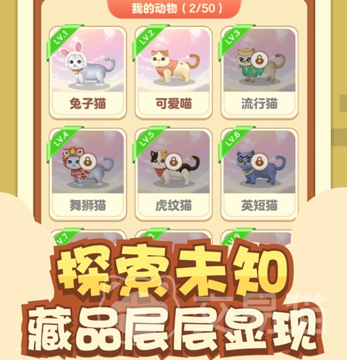 在这款治愈的游戏中,玩家可解锁很多小动物,除了猪猪之外,还有小猫、小狗等等,可将这些动物养在自己的农场中。每天及时喂饲料喂水,随着等级提升,两个相同种类动物合成在一起,可以解锁更高的等级,也能解锁更多的图鉴。