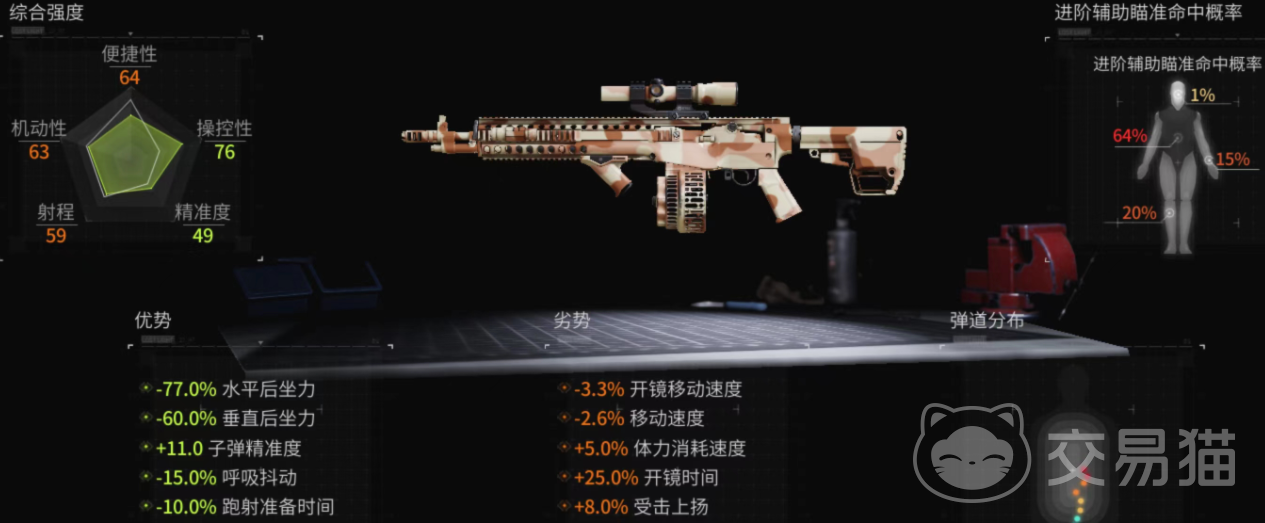 这一把武器在还没有改装之前机动性也算可以,达到了52,但操控性基本上是零,就是说大家需要费点劲去驾驭它。精准度是31,这个还有提升的空间,射程挺不错的,有81。便携性就稍微差点了,只有35,其实这枪没改装前也算是各有千秋,但肯定还有改进的地方。这把连狙枪的射速有点受限,稳定性也不算太好,不过,在像秋山这样的大地图上,它却能发挥出意想不到的效果。