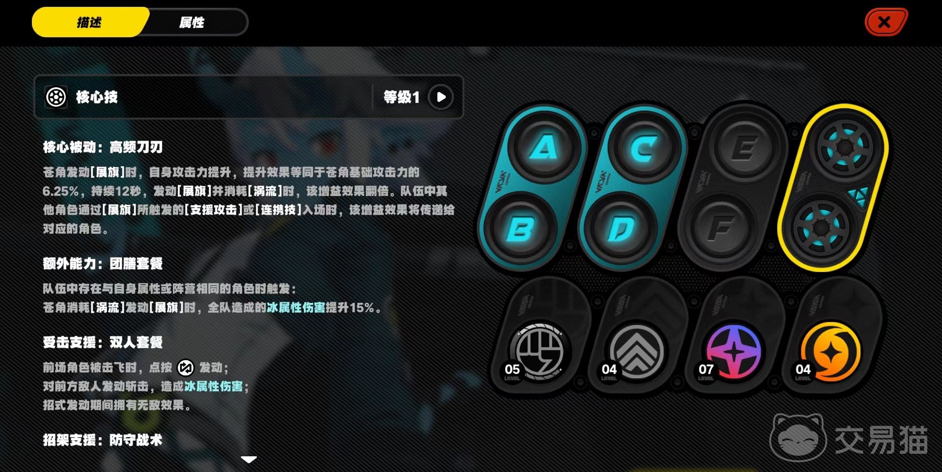 所以在技能进行加点的时候,应该优先选择能够使收益最大化的技能。对于苍角来说,核心技是最关键方面,所有辅助所需要的内容都在核心技中有所体现。它的核心被动在苍角发动展旗时自身攻击力提升。发动展旗并消耗涡流时增益效果翻倍。队伍中其他角色通过展旗所触发入场时,该增益效果则会传递给相应角色,另外还有额外能力,如果存在与自身属性或阵营相同角色就可以触发。当苍角消耗涡流发动展旗时,全队其他成员造成冰属性伤害提高。