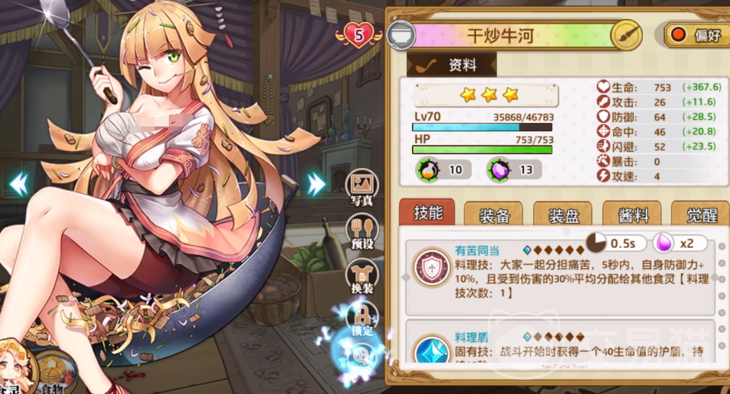 干炒牛河是游戏里的一个三星角色,这个角色的属性是主食,主是在游戏里承担的是前排近战输出,在搭配的时候一般会和主菜统一都放到前排一个承担防御的作用,一个承担输出的作用,这个小吃在现实生活中制作起来相对来说比较麻烦,所以游戏里这个角色的攻击技能比较优秀,但是攻击速度和命中率相对来说会差一些,如果想选择一个攻击能力比较强的角色,那就可以让干炒牛河成为游戏的主要输出。