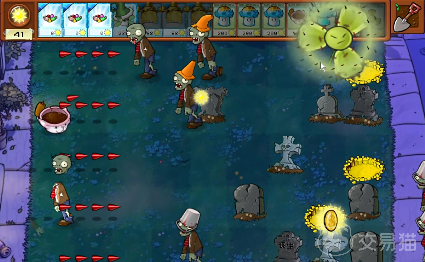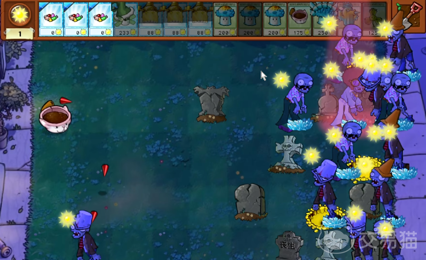 当三叶草使用完毕后,差不多来到了第一波迪斯科僵尸出场的时候,这时候要在一波接一波敌人出现的间隙中使用寒光菇来减缓敌方的进攻节奏,同时保证寒光菇能尽可能多的命中敌人,因为命中的越多收集到的阳光数量越多,这样在第一波尸潮之前总共可以收集三大波阳光,间隙中再种植上猫砂盆和两个寒冰仙人掌就足矣应对第一波。