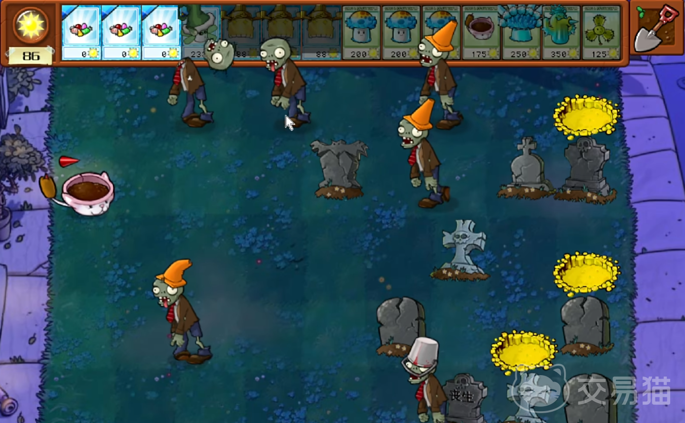 当出现第一只铁桶僵尸的时候,有不少朋友看到下方的普通僵尸已经比较靠前了,就非常紧张,把阳光用在种植第二个猫砂盆上了,这样就会导致阳光供应不充足,两个猫砂盆无法抵挡后面的迪斯科僵尸,所以这时候正确的做法是快速将三个宝藏吞噬者种植在地上,这样不仅能将墓碑啃食掉,还能持续不断地提供阳光,保证后面阳光足够充足。