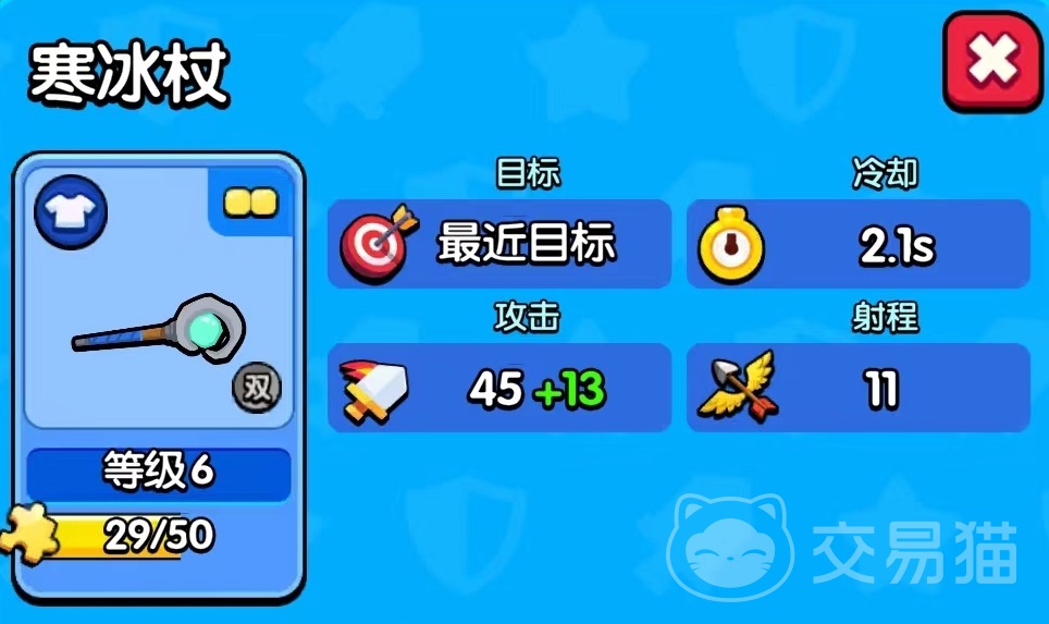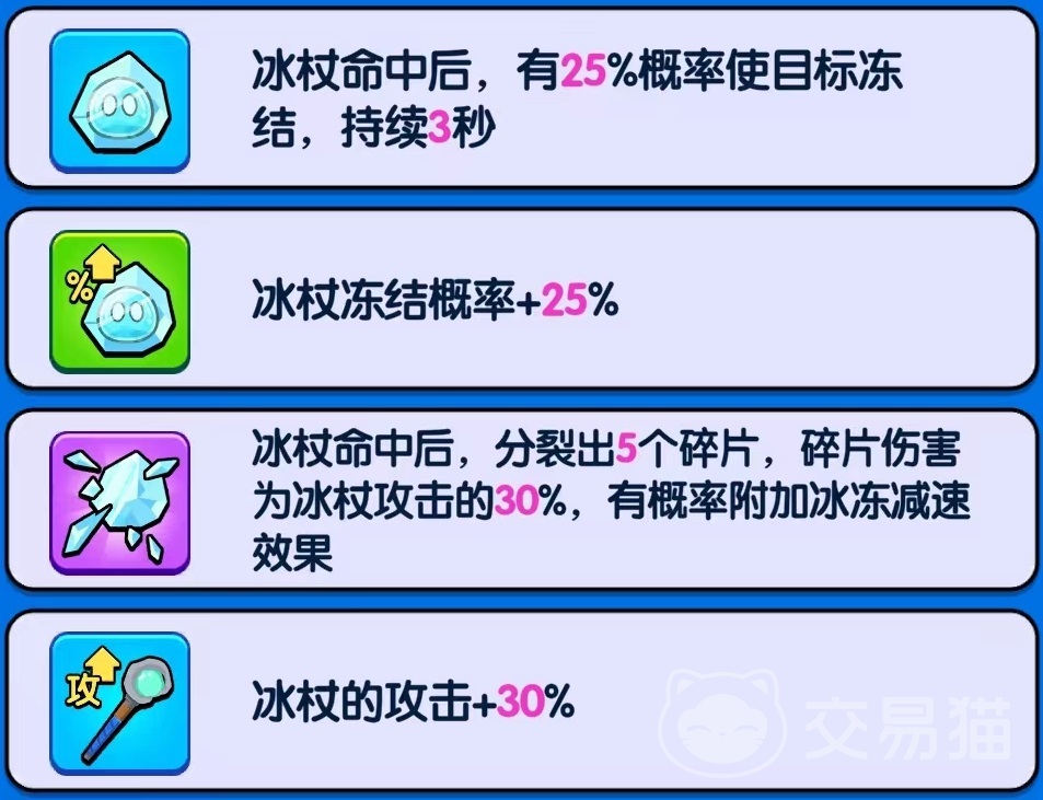 寒冰杖虽然属于蓝色品质,但是自身在培养深度方面却很可观,最多能够升级到11级,所附加效果非常理想,触发冷却时间只有2.1秒,属于很快的类型,射程也比较远为11点,在极远处就能直接发动。所附加的效果主要有以下几类,等级比较低的时候就能够附加冻结概率提升和命中后有机率使目标冻结这两项属性,对方冻结之后短时间内无法移动,在这样的闯关游戏中可以给输出带来很大的机会,尤其是在面对boss时,将对方冰冻住方便一起集火秒掉。