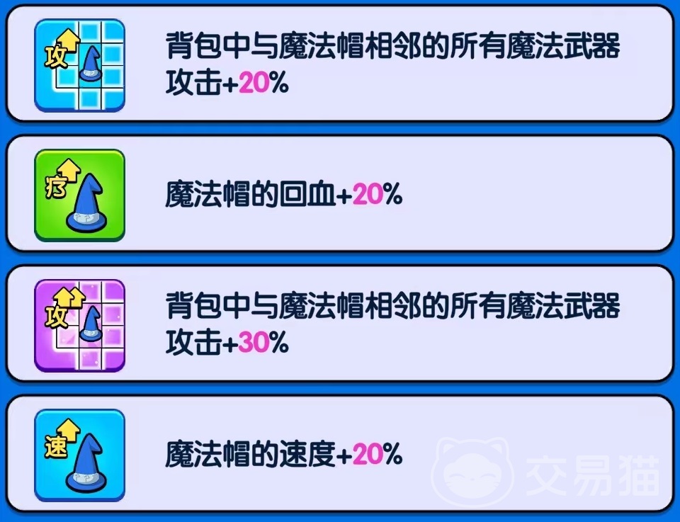 在生存能力方面,虽然魔法帽不如腰带提升明显,但是魔法帽有一个不可取代的属性,那就是自身对魔法武器的加成。魔法帽所附加的4种状态有着很大用处,例如背包中与魔法帽相邻的所有魔法武器,都能增加30%攻击,其他效果还有增加魔法帽20%回血和20%触发速度等。