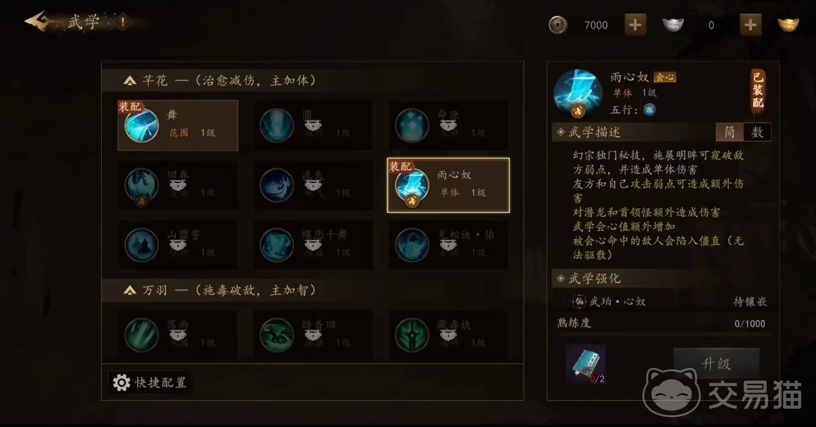 再来看一下万羽武学,第1个落雨,利用内力推动,将真气化成雨造成范围伤害。第2个暗香回,在第敌方目标周围造成范围伤害后,并将其相互连接起来,被连接之后会进行伤害传导。第3个藏毒决,对目标造成单体伤害,并施加中毒状态,中毒可以进行叠加,降低敌人治疗恢复效率。第4个驱渊鱼,在友方单位四周扩散粉蝶,造成范围伤害后,同时具有驱散异常状态能力。第5个幽冥一剑,除了单体伤害可观之外,还会对目标施加虚弱,使其降低各项属性。第6个追影显踪,利用对气息的感知能力,并将自身内力扩散出去,造成范围伤害外,还将附近隐身敌人抓出来使其显行,敌人被显行后闪避值会下降,如果抓到的是玩家,还有额外伤害。最后一个无相诀攻,对友方施加祝福效果,大幅度提高伤害。