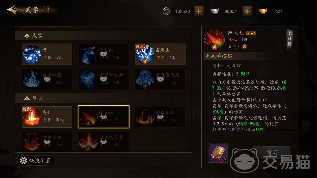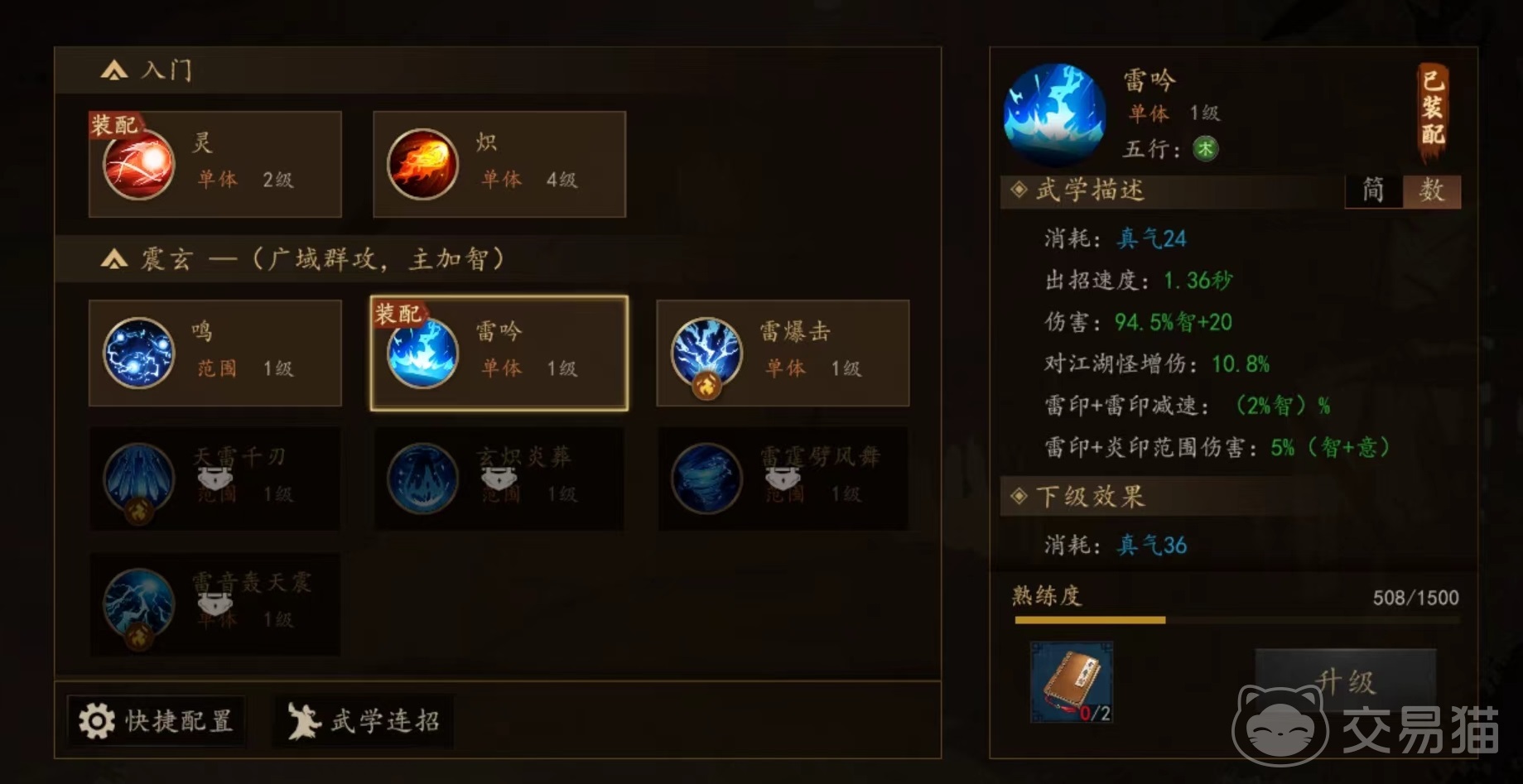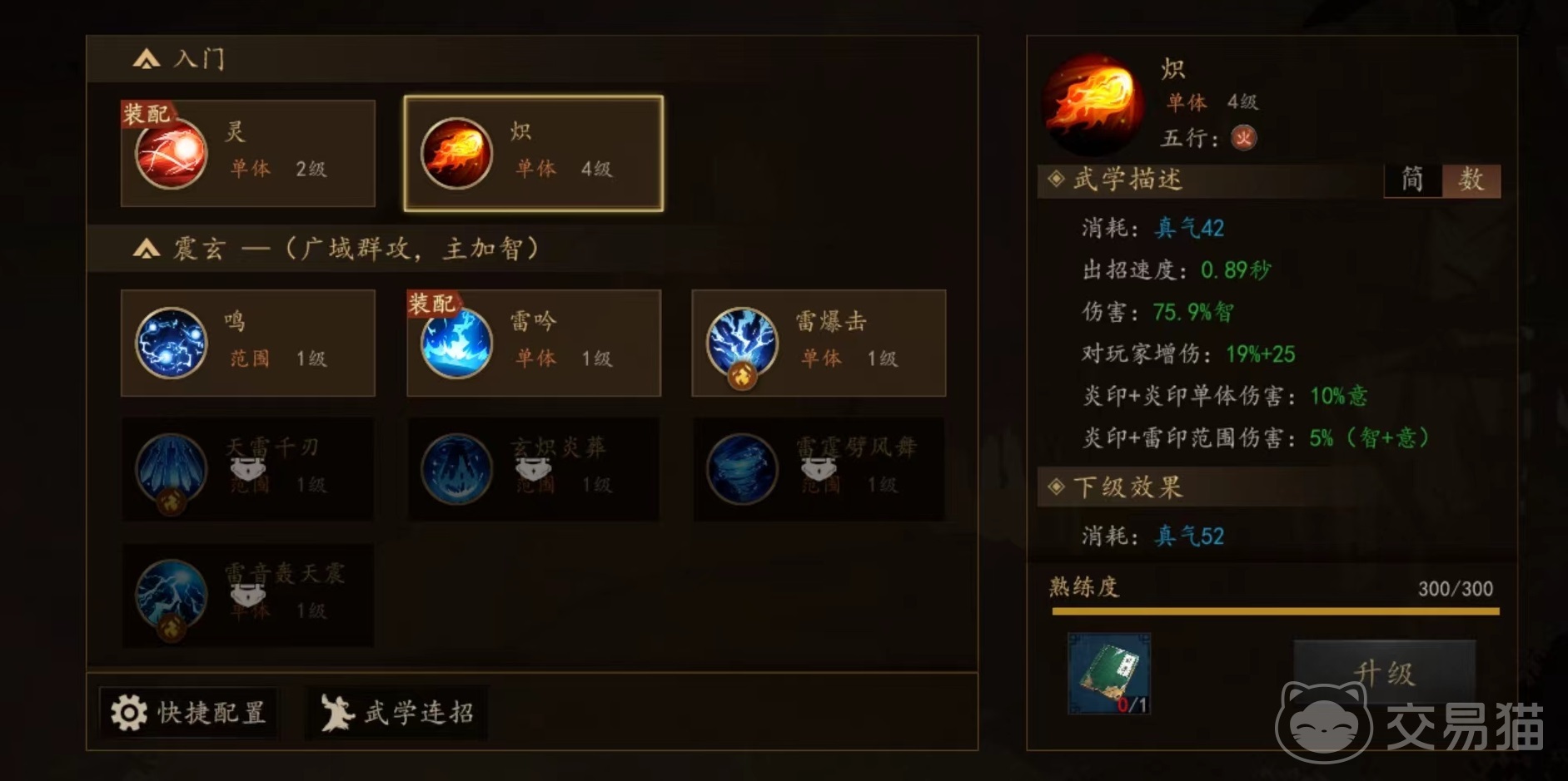 先来看一下震玄武学,擅长群体攻击,需要主加智力。第1个鸣,属于范围伤害,利用掌心雷攻击敌人,击中敌人后附加雷印,使用要消耗真气,出招速度很快。第2个雷吟,单体伤害类型,凝聚内力降下惊雷,击中敌人后附加雷印。第3个雷暴击,吸纳天地灵气后对敌人出手造成单体伤害,并附加雷印。第4个天雷千刃,同样是单体输出类型,用内力推动雷霆化为剑,造成伤害后附加雷印。第5个玄炽炎葬,玄门秘术,施展后大范围都会被灼热所覆盖,造成范围伤害,击中敌人后,如果其身上带有炎印,则造成额外加成。第6个雷霆霹风舞,同样是范围输出类型,激发神雷之能旋转攻击敌人,击败敌人后获得移速提升效果,击中后附加雷击。第7个雷音轰天震,采用九天玄雷攻击目标,造成高额单体伤害。